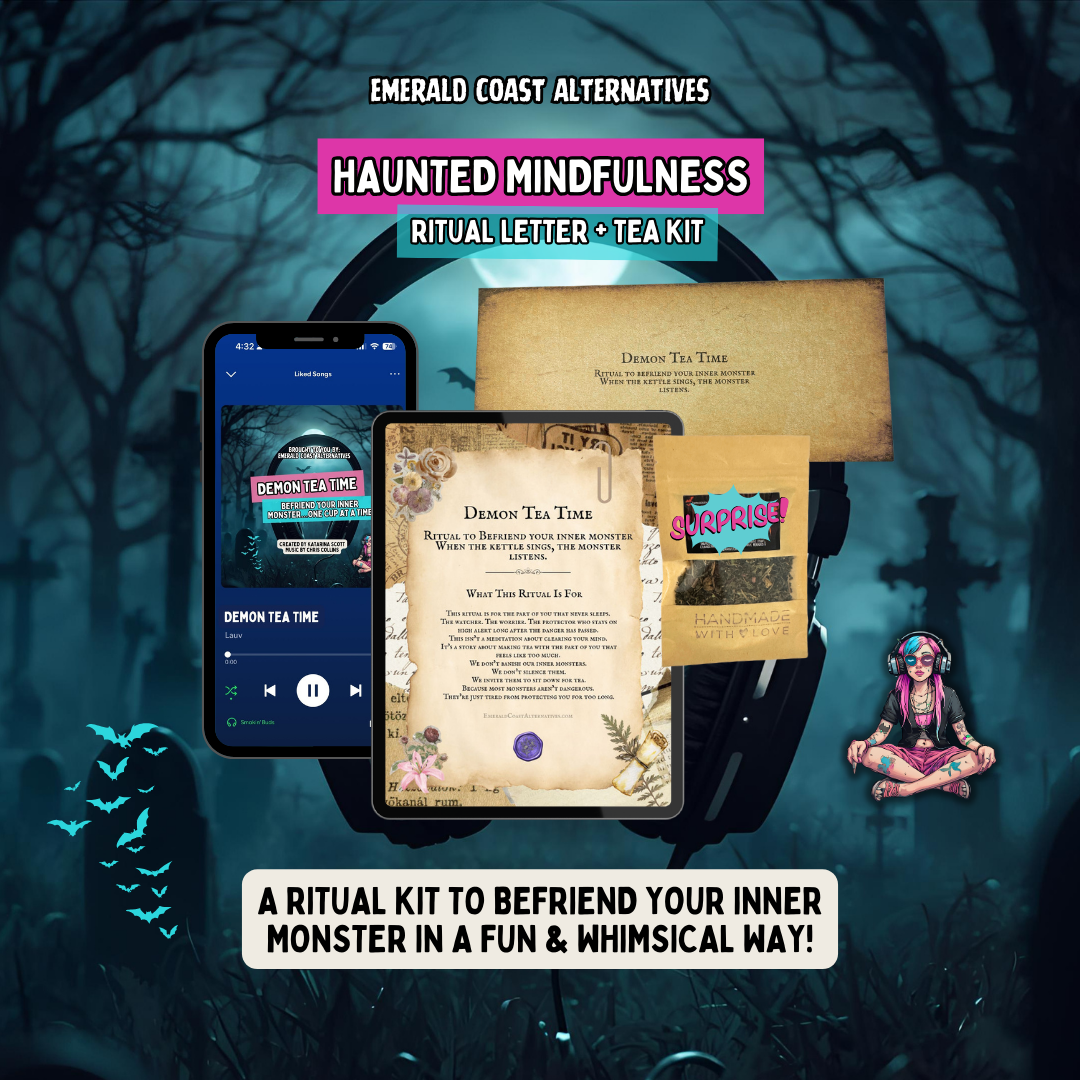 Demon Tea Time is a 6.5-minute haunted mindfulness ritual designed for anxious nights, overstimulated days, and nervous systems that don’t respond to being told to “just calm down.”
