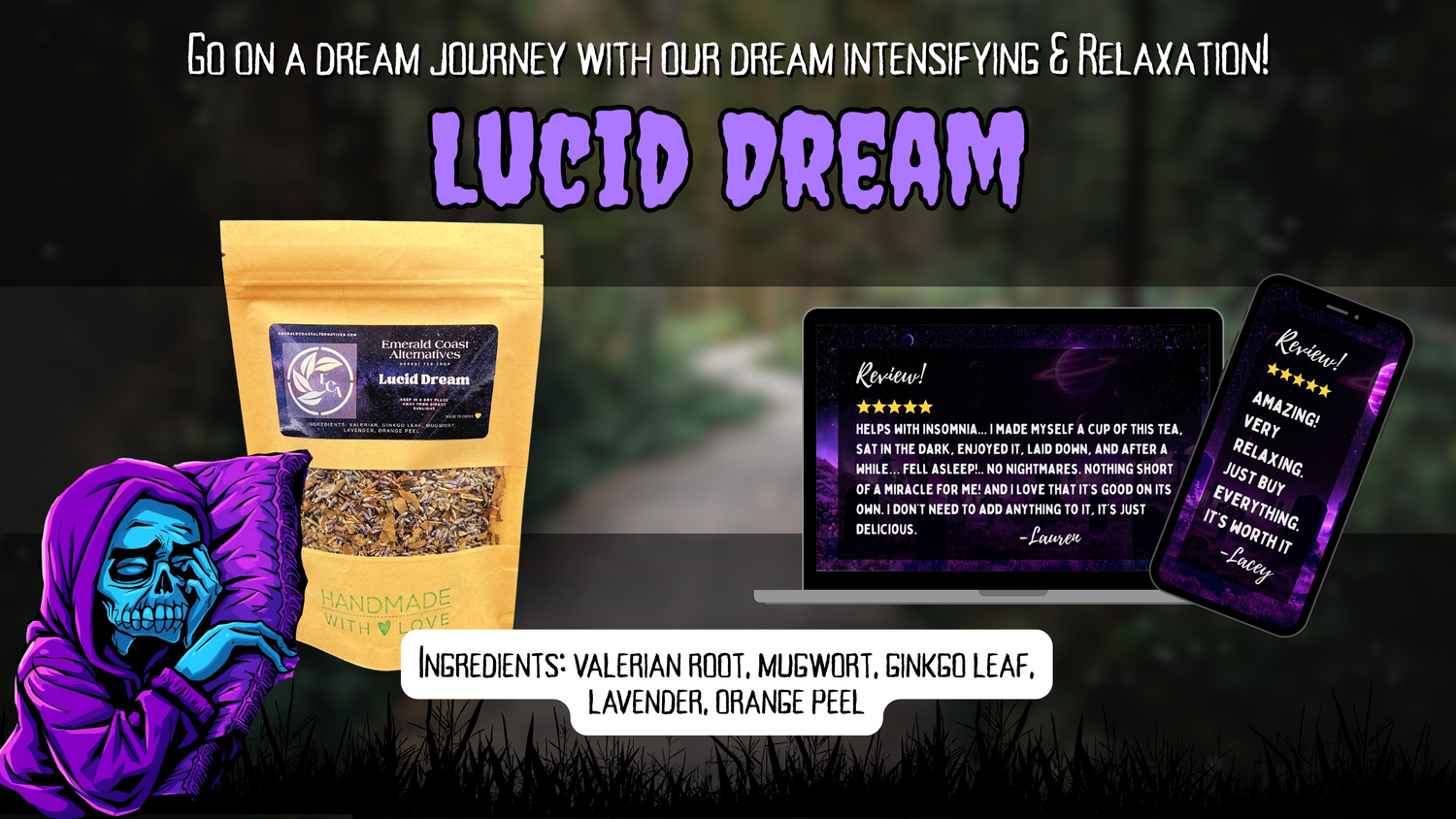 Ingredients: Valerian Root, Mugwort, Ginkgo Leaf, Lavender, Orange Peel