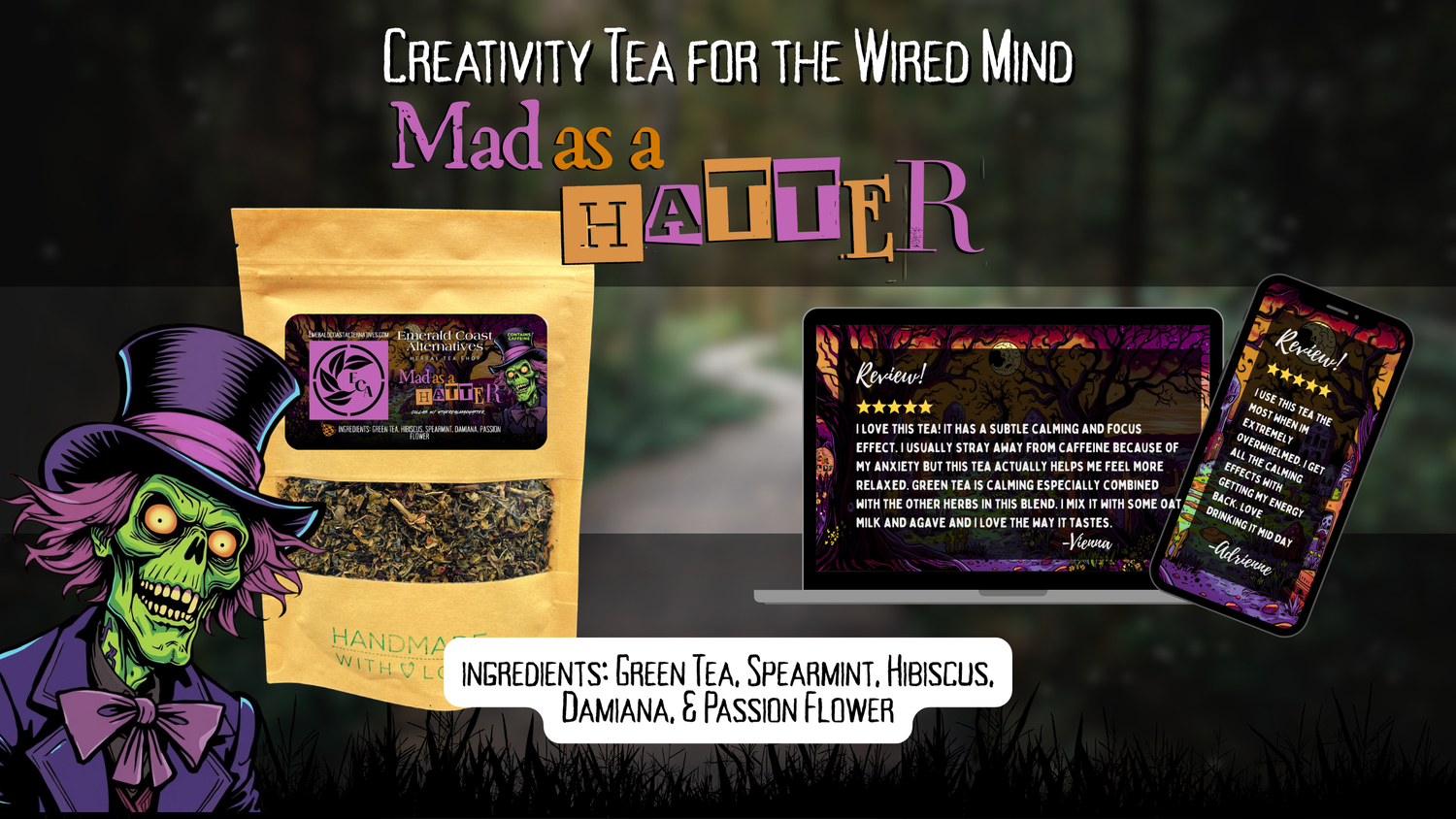 Bright spearmint meets smooth green tea, with hibiscus bringing a tart pop and damiana adding a wild herbal kiss. It is refreshing, creative, and just mysterious enough to keep you curious.