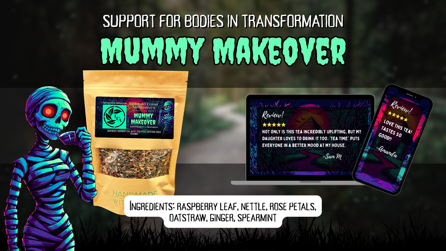 Mummy Makeover is a gentle, non-caffeinated herbal tea created for bodies moving through pregnancy, postpartum, hormonal shifts, emotional upheaval, and caretaker aftercare.