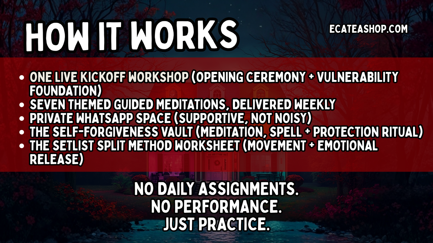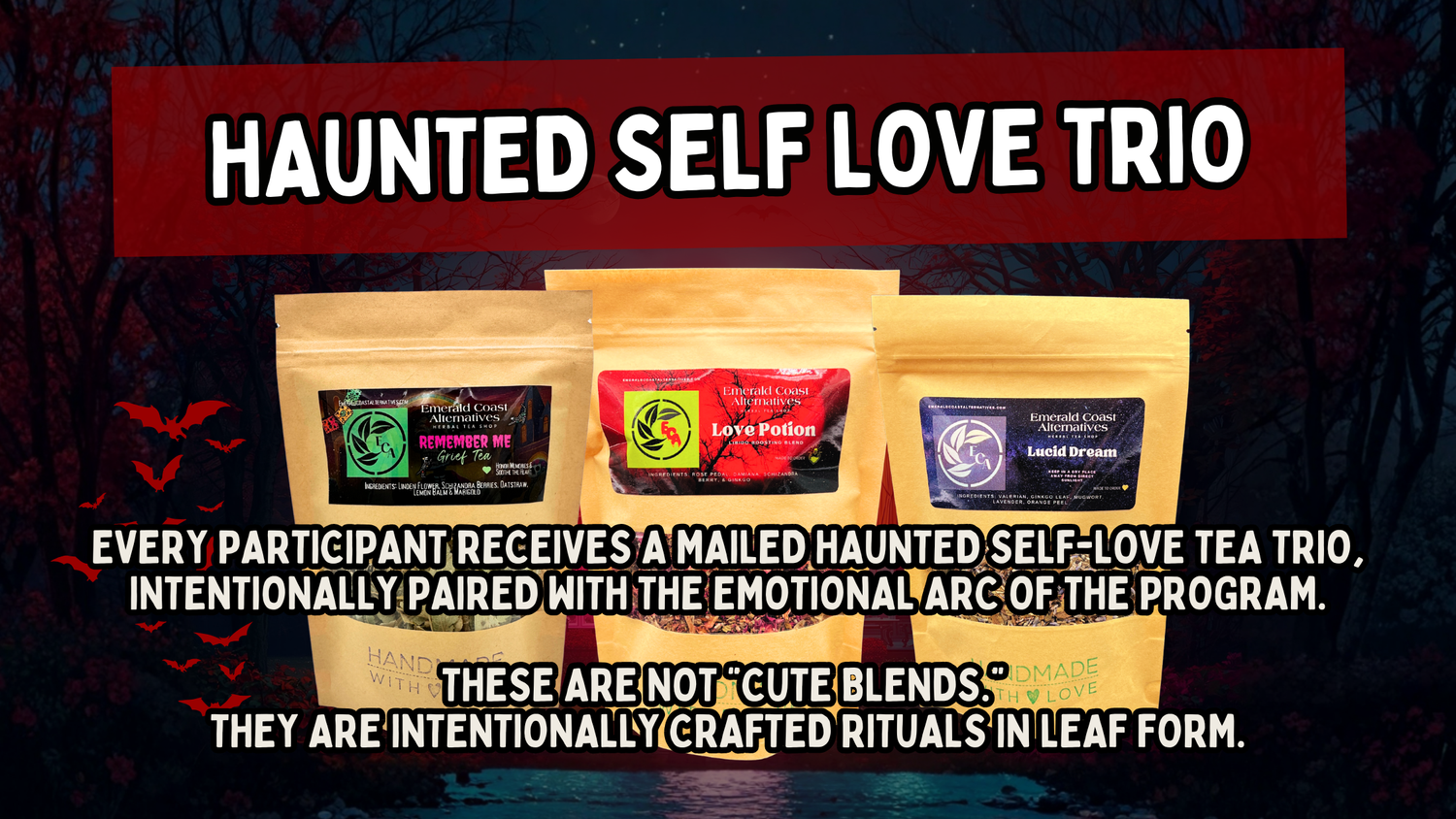 Every participant receives a mailed Haunted Self-Love Tea Trio, intentionally paired with the emotional arc of the program.